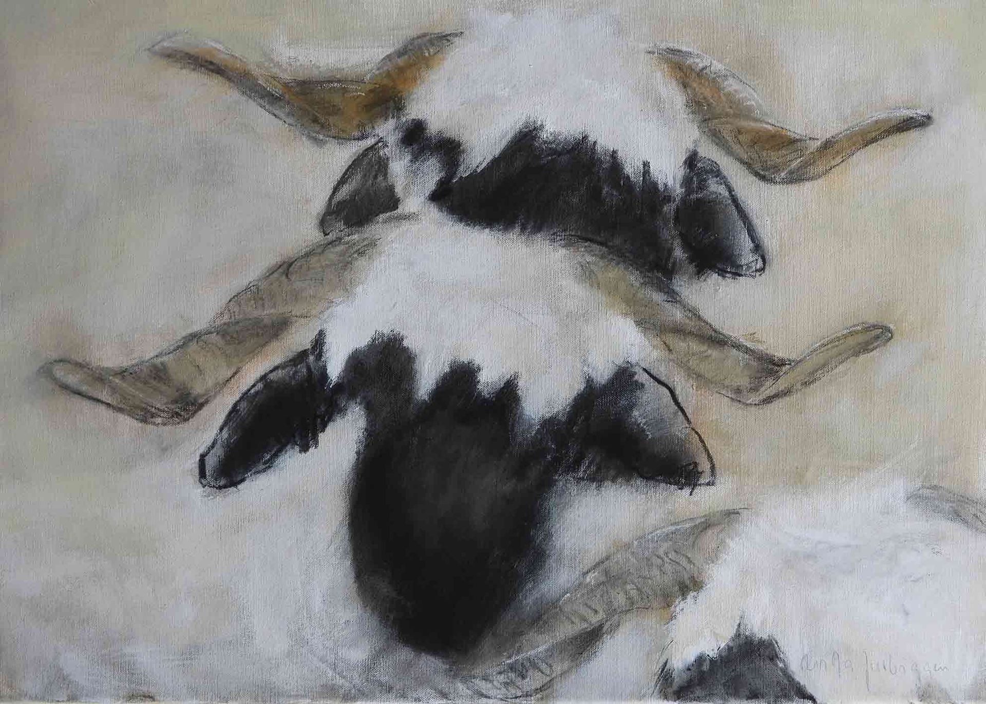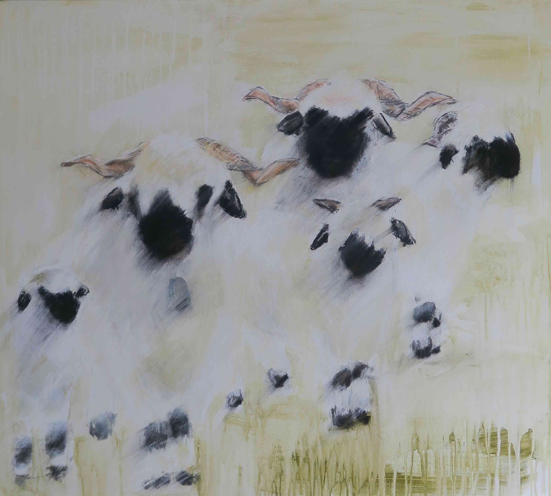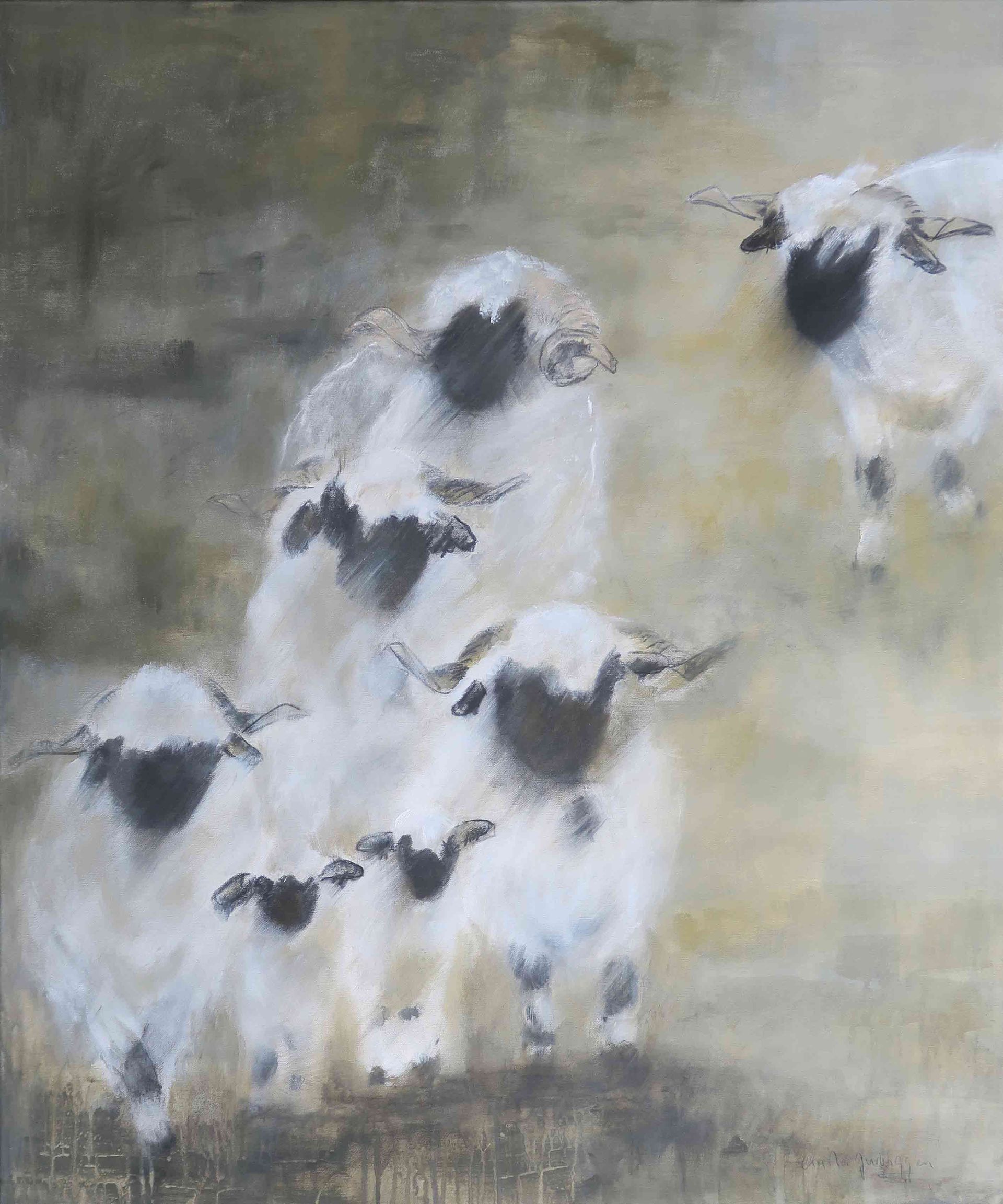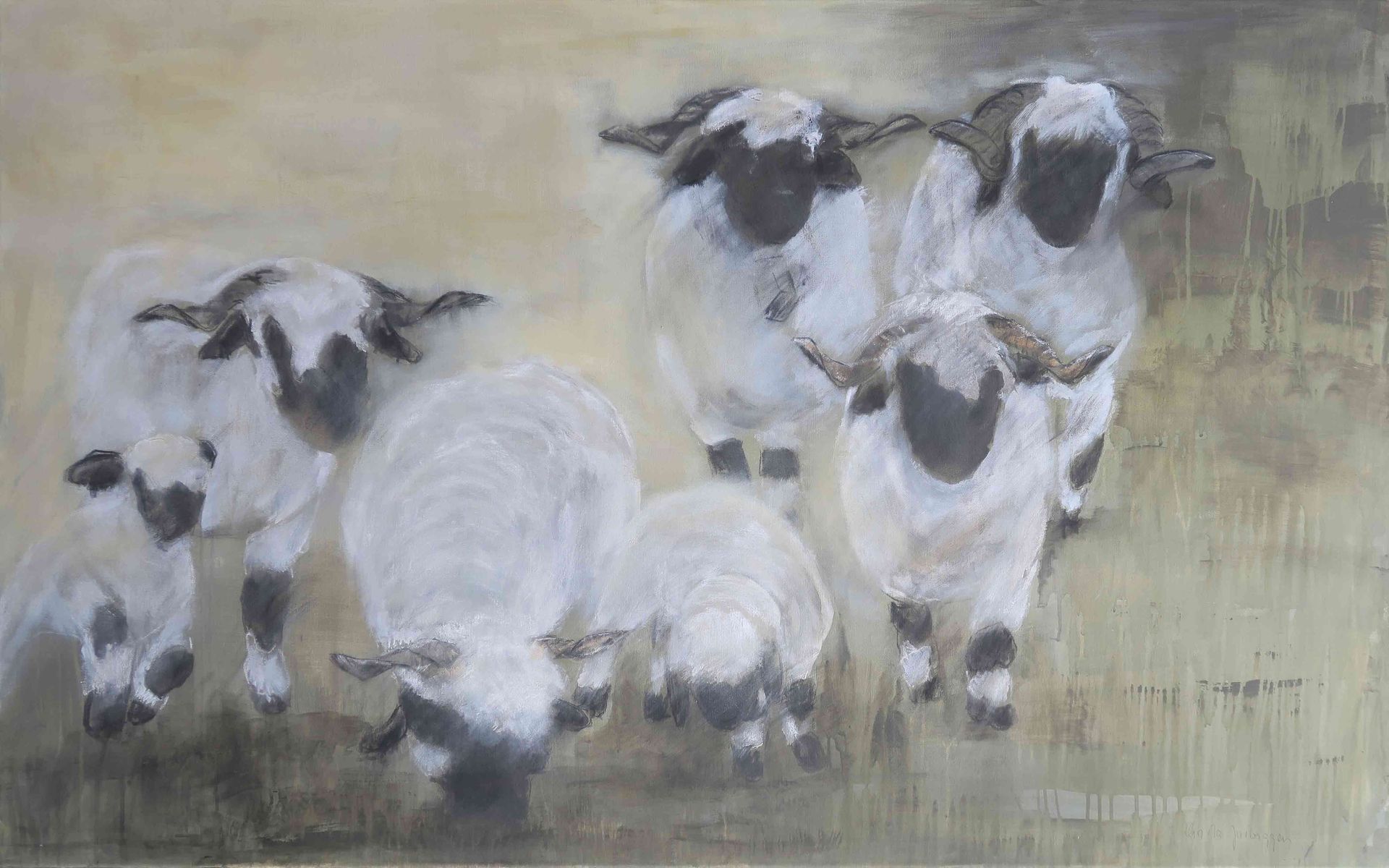 100 X 120 4 Walliser Schwarznaschenschafe mit Lämmer
