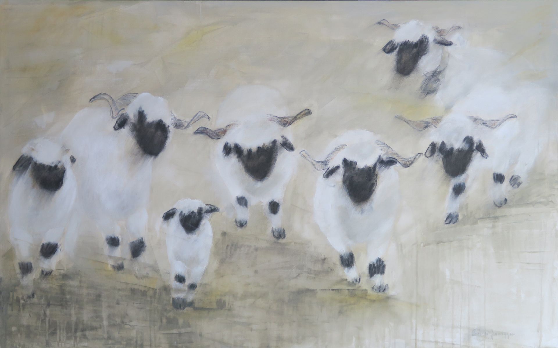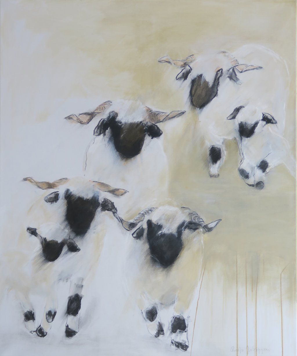 100 X 120 5 Walliserschwarznasenschafe mit 2 Lämmer